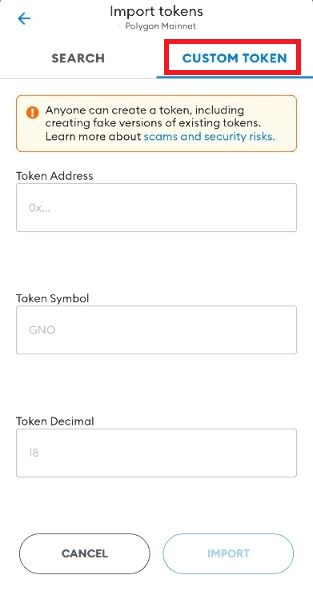 To add a custom token, after clicking "Import Token" click on "CUSTOM TOKEN"