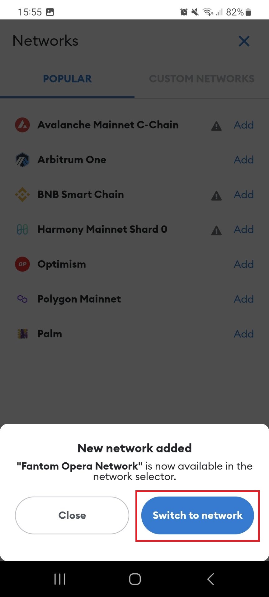 The next pop-up is just to confirm you have added the network and asks if you wish to switch to it. Click "Switch to Fantom Opera"