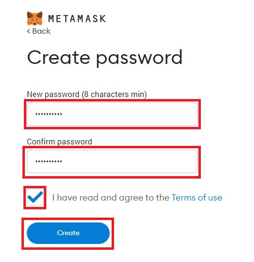 Create a password, agree to terms of use and click "Create"