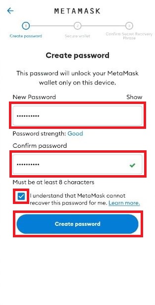 Set up a new password, confirm password and agree to metamask not recovering passwords. Click "Create password".